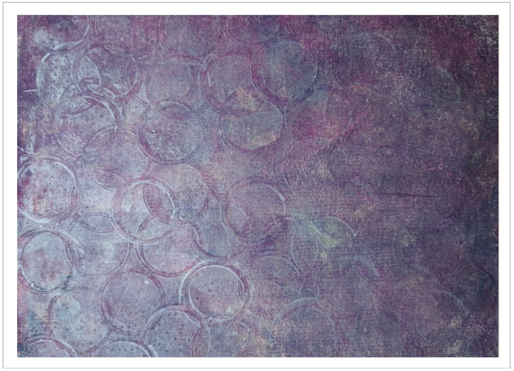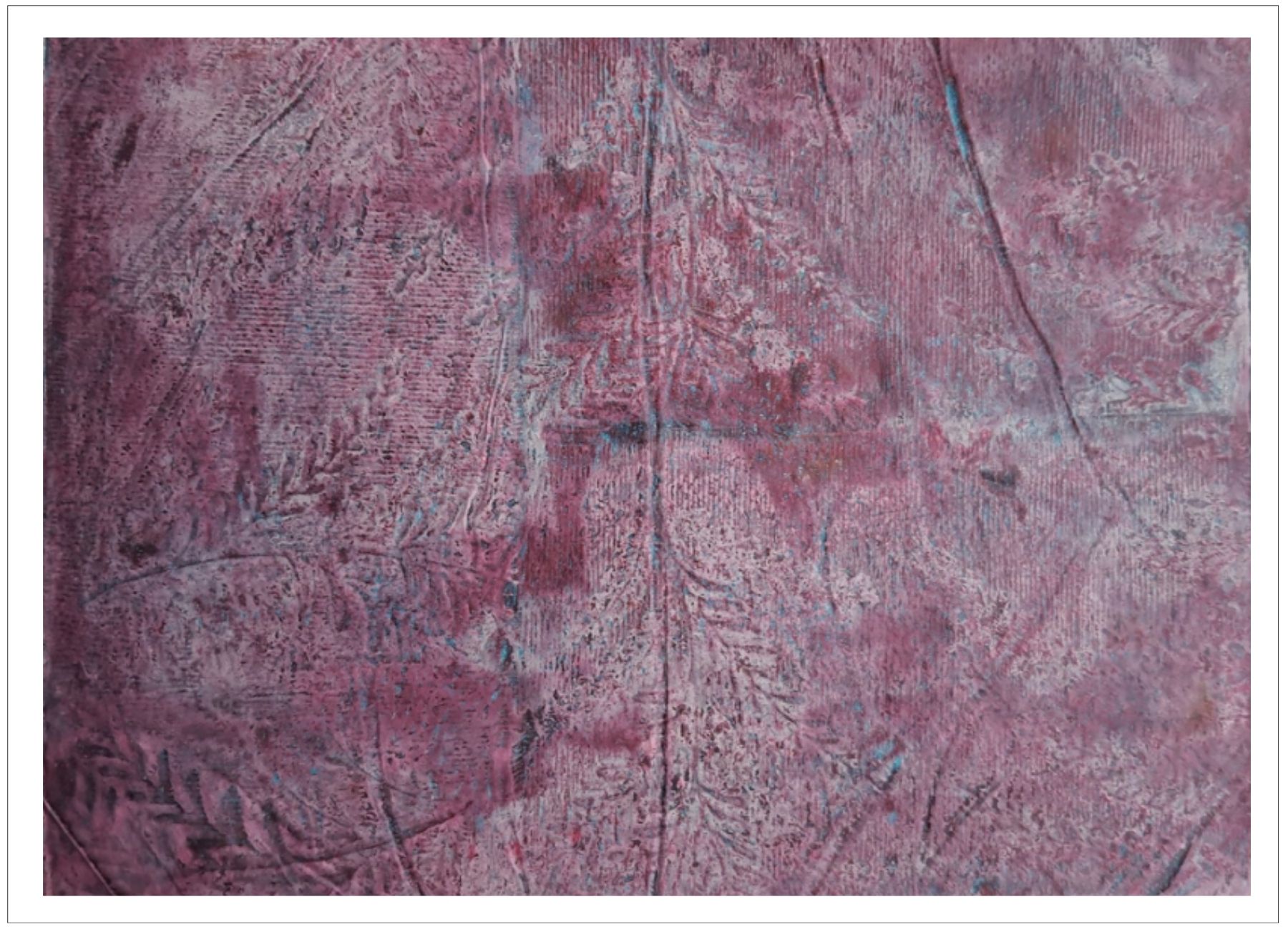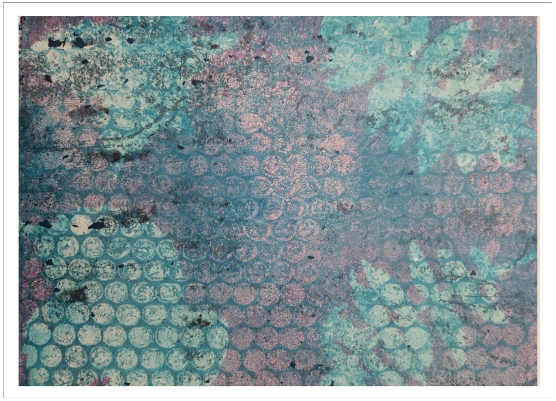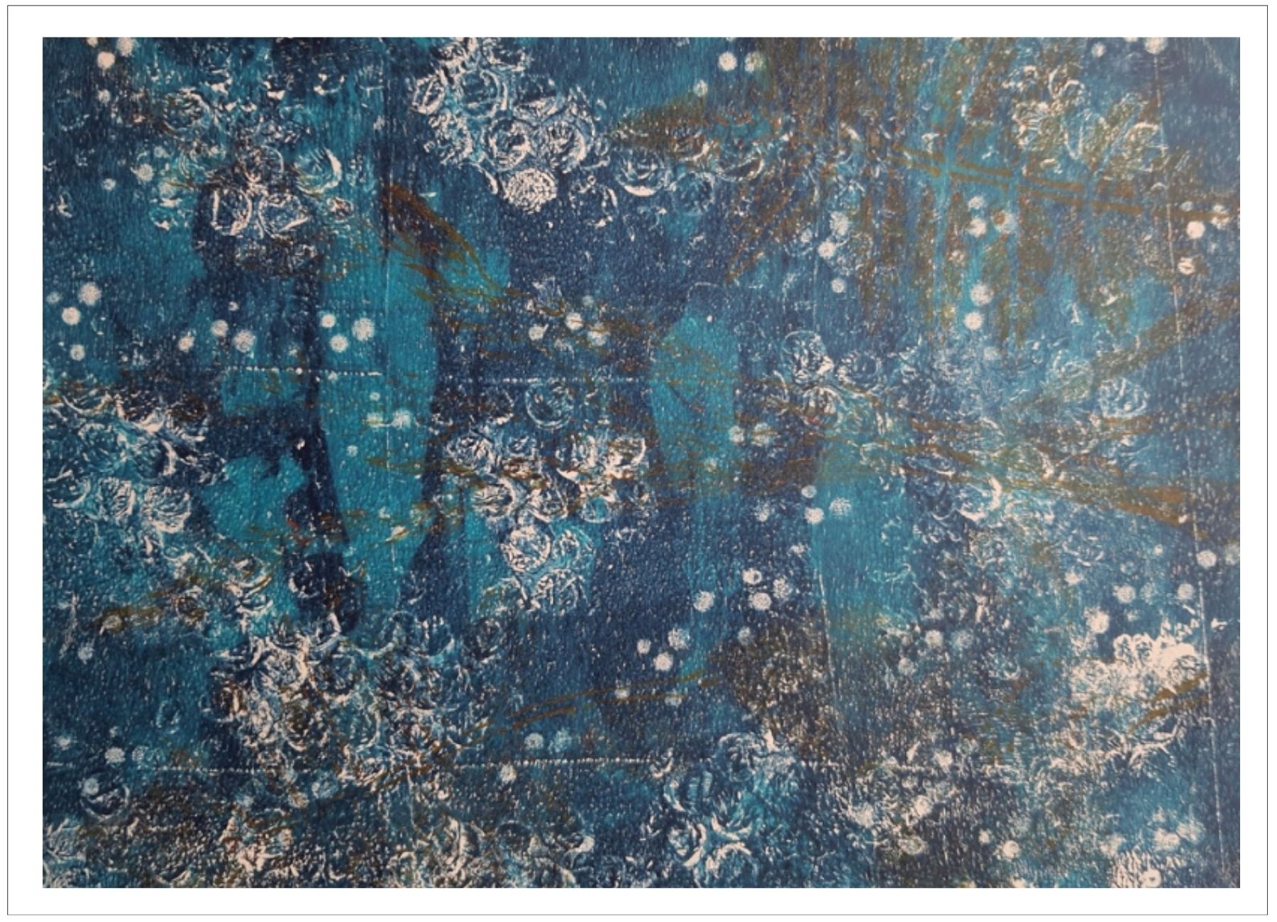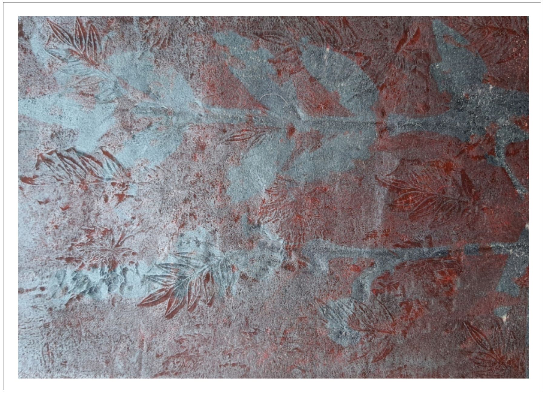Každý otisk vzniká postupným přidáváním vrstev, tvarů a textur. Proces je hravý a otevřený – nikdy není úplně jasné, jak bude výsledný obraz vypadat.