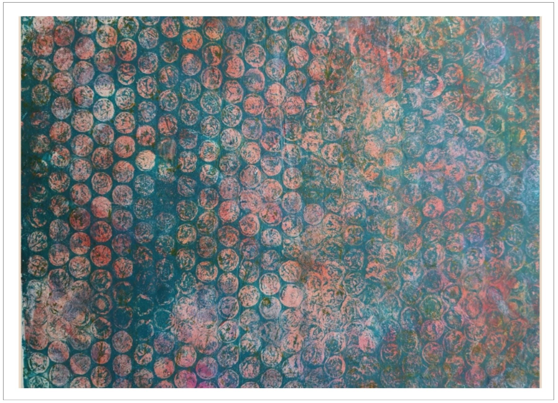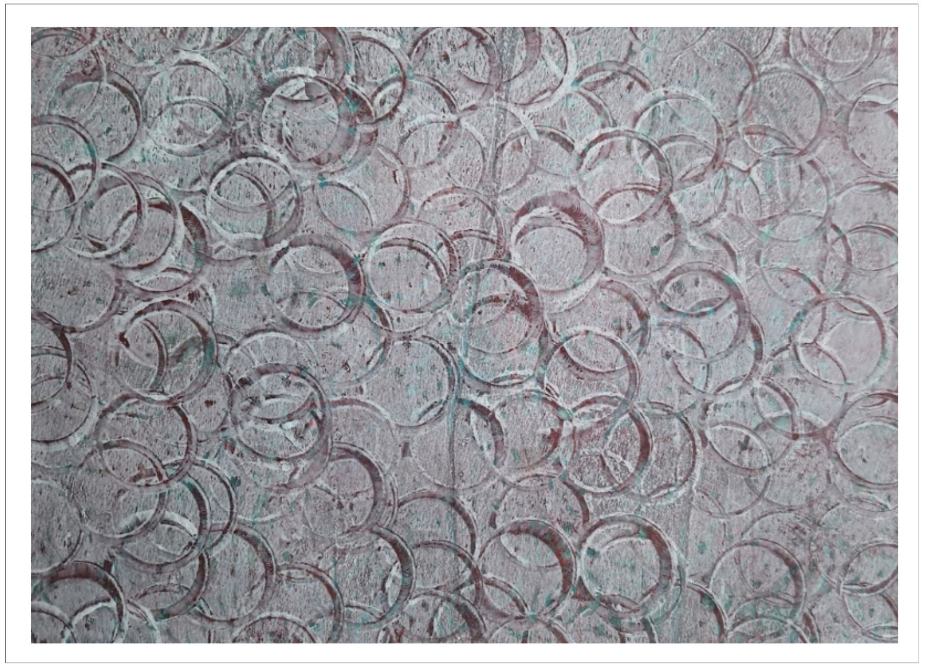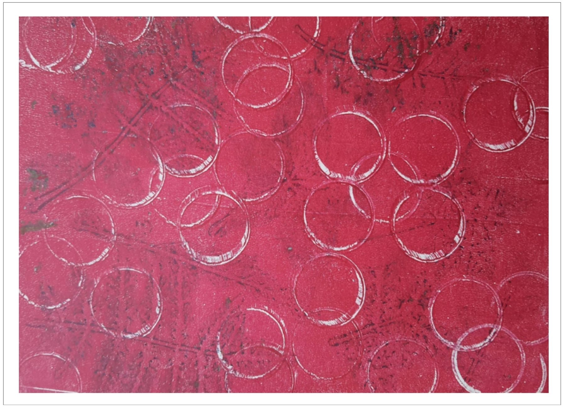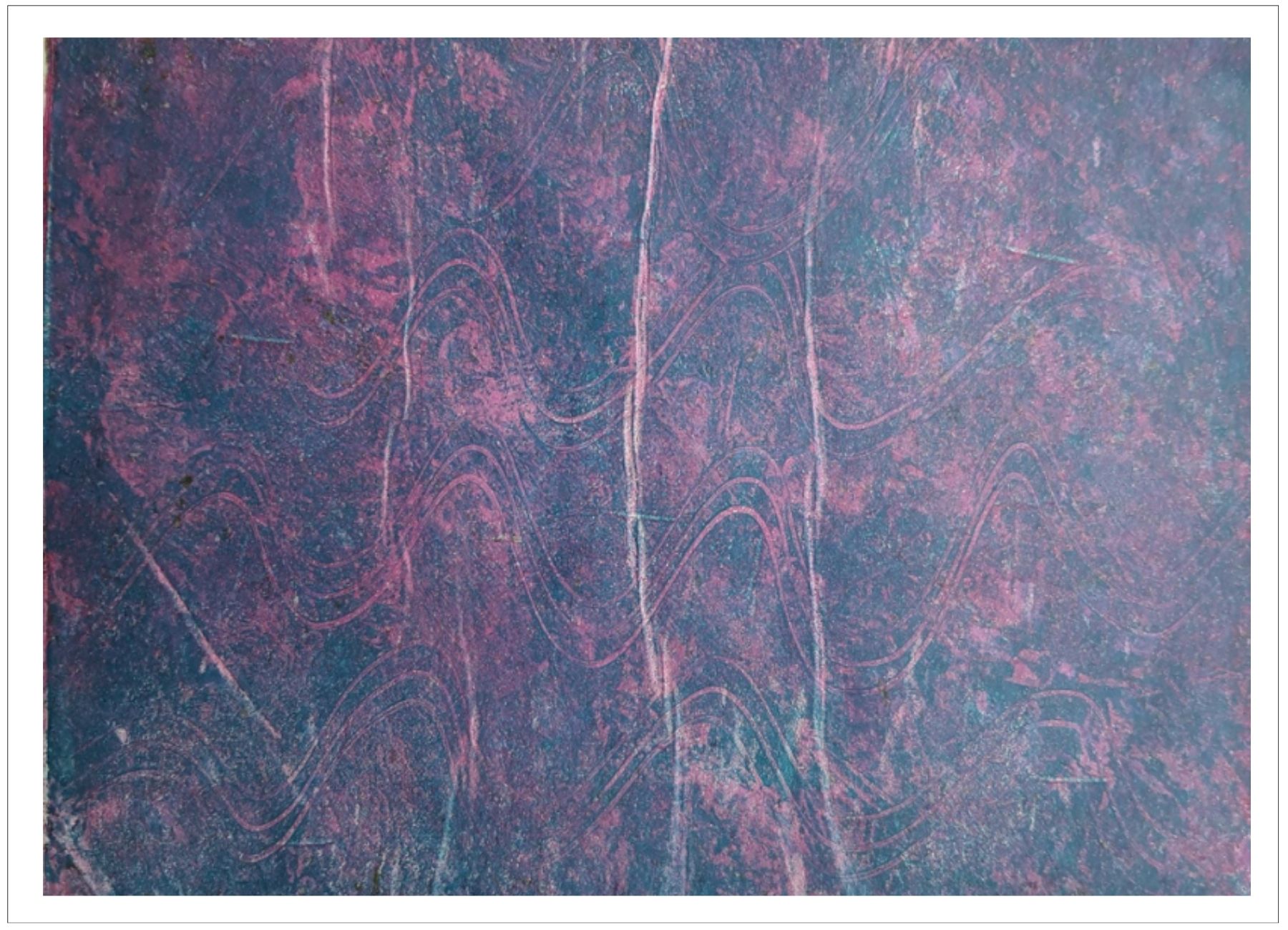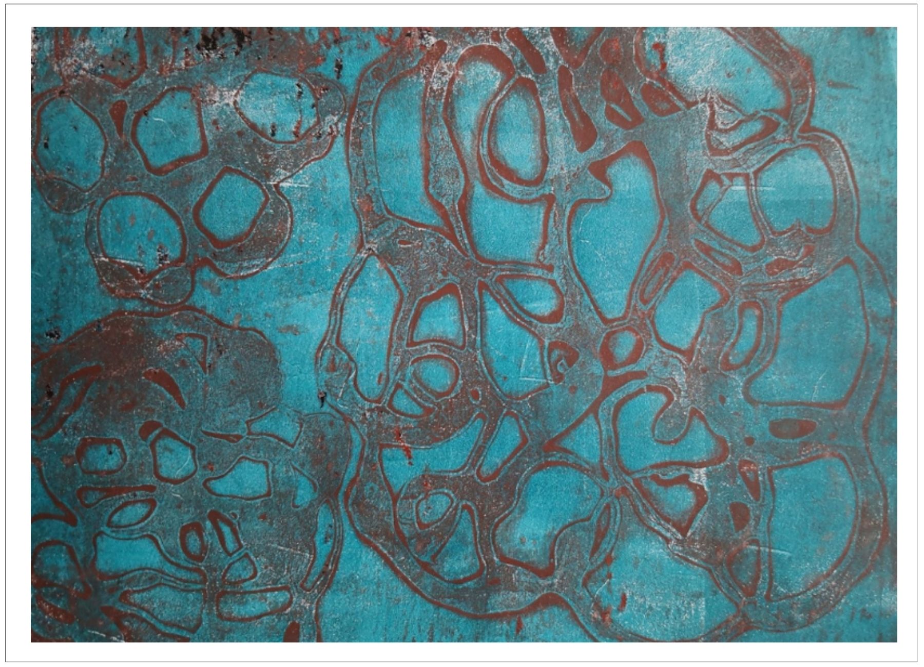 Každý otisk vzniká postupným přidáváním vrstev, tvarů a textur. Proces je hravý a otevřený – nikdy není úplně jasné, jak bude výsledný obraz vypadat.