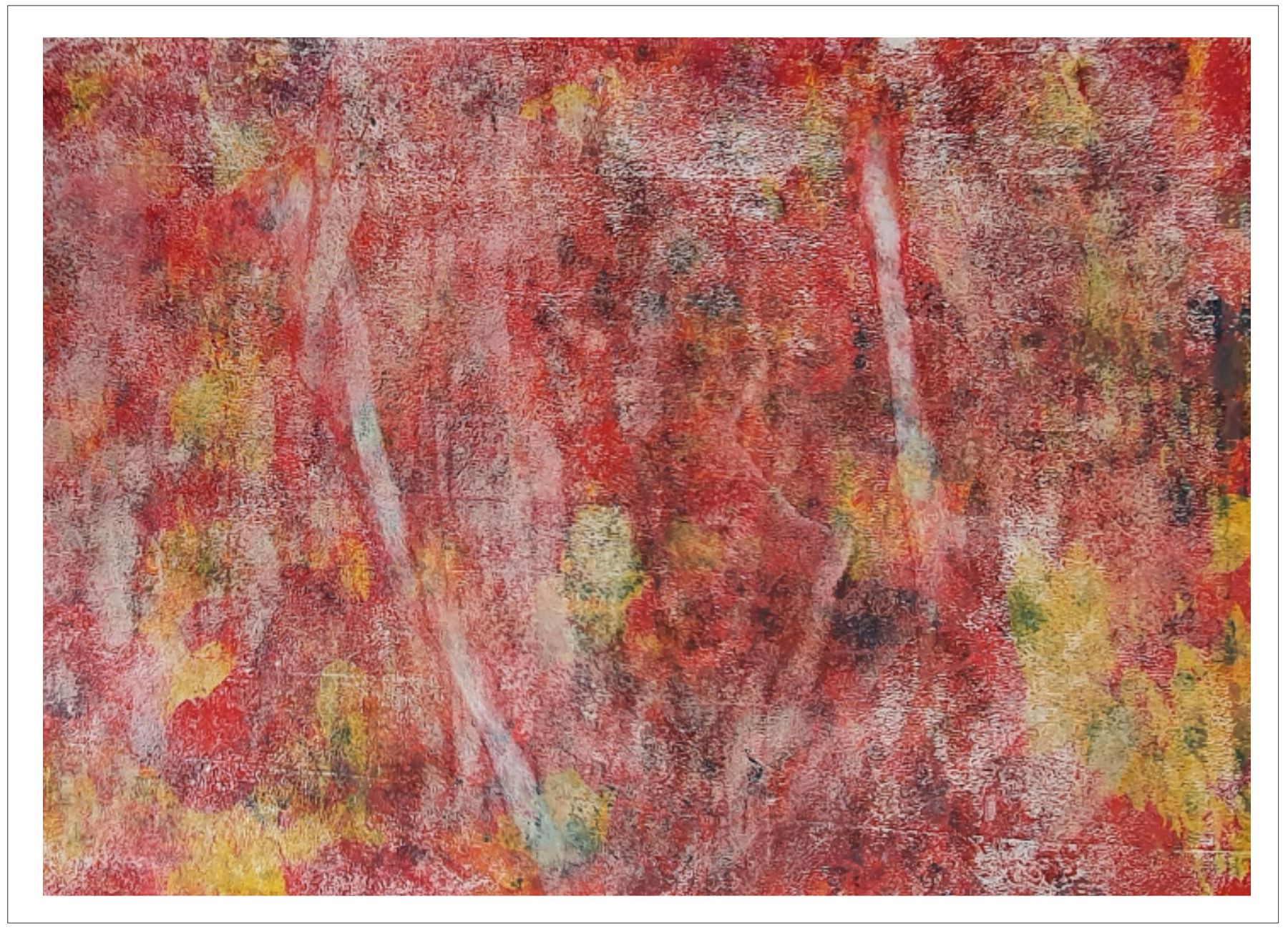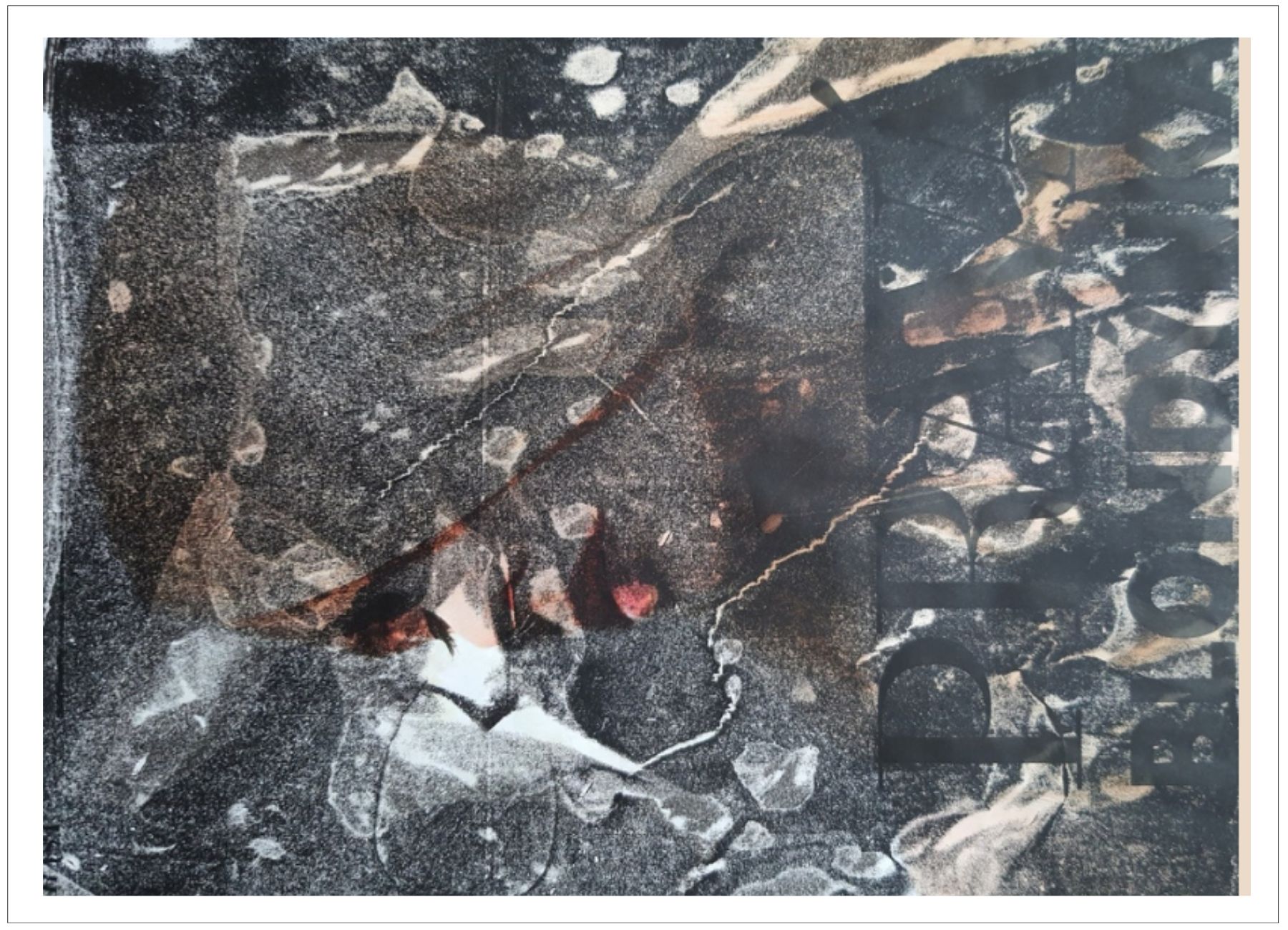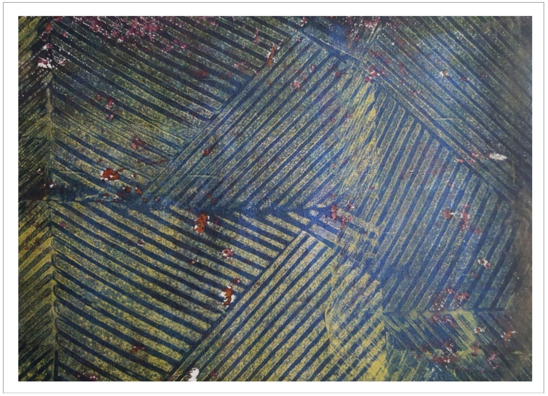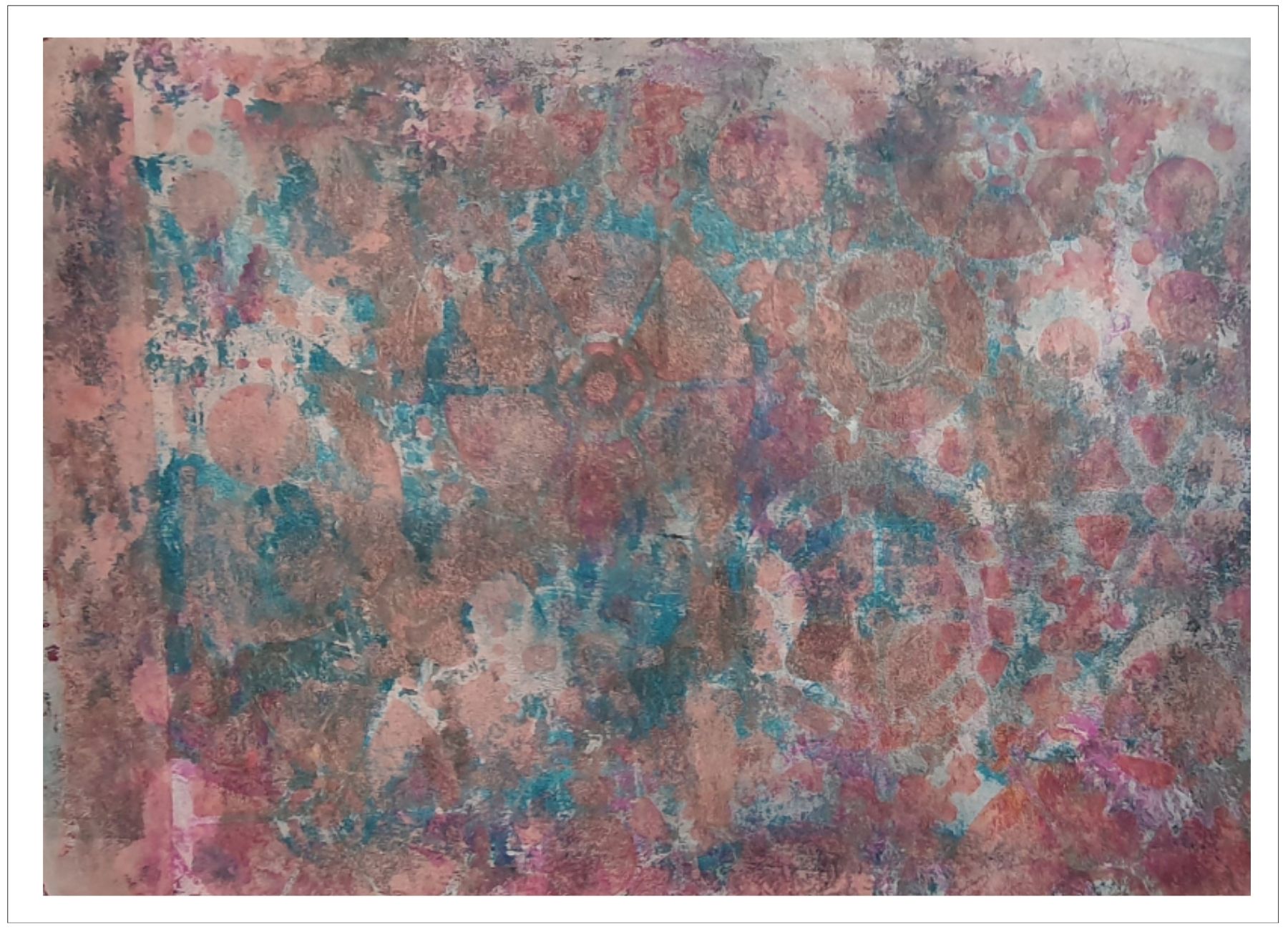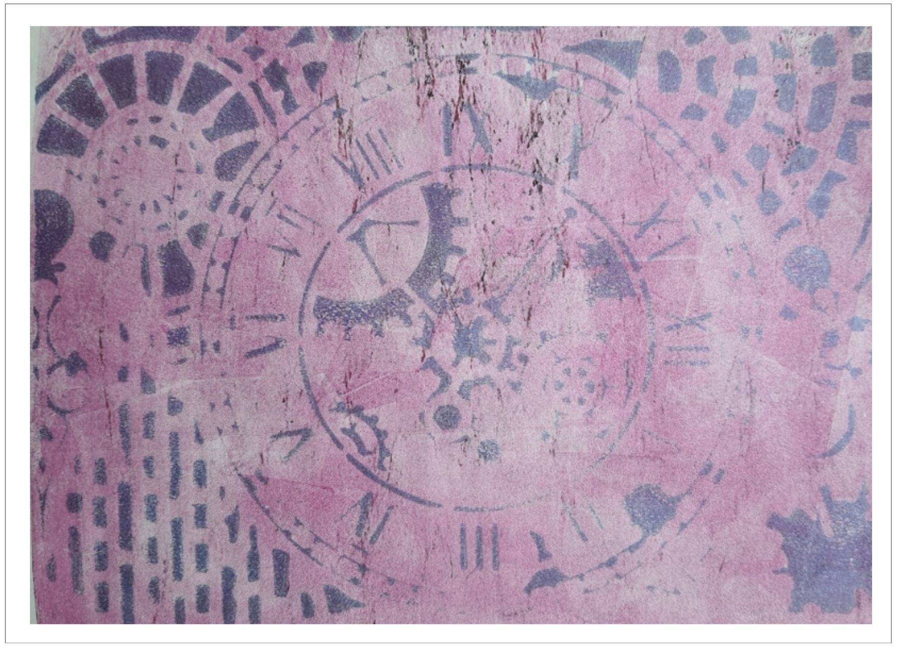 Každý otisk vzniká postupným přidáváním vrstev, tvarů a textur. Proces je hravý a otevřený – nikdy není úplně jasné, jak bude výsledný obraz vypadat.
