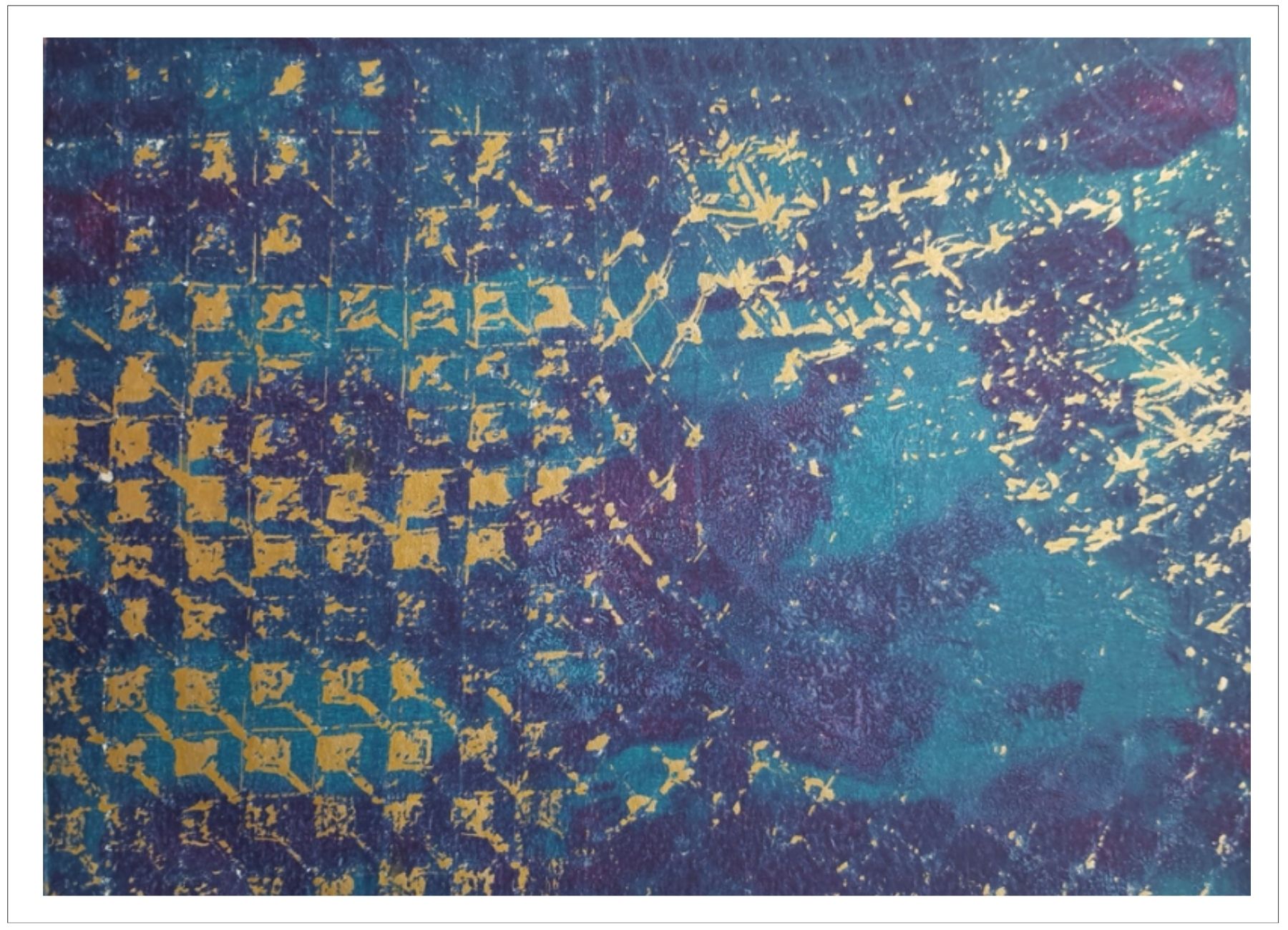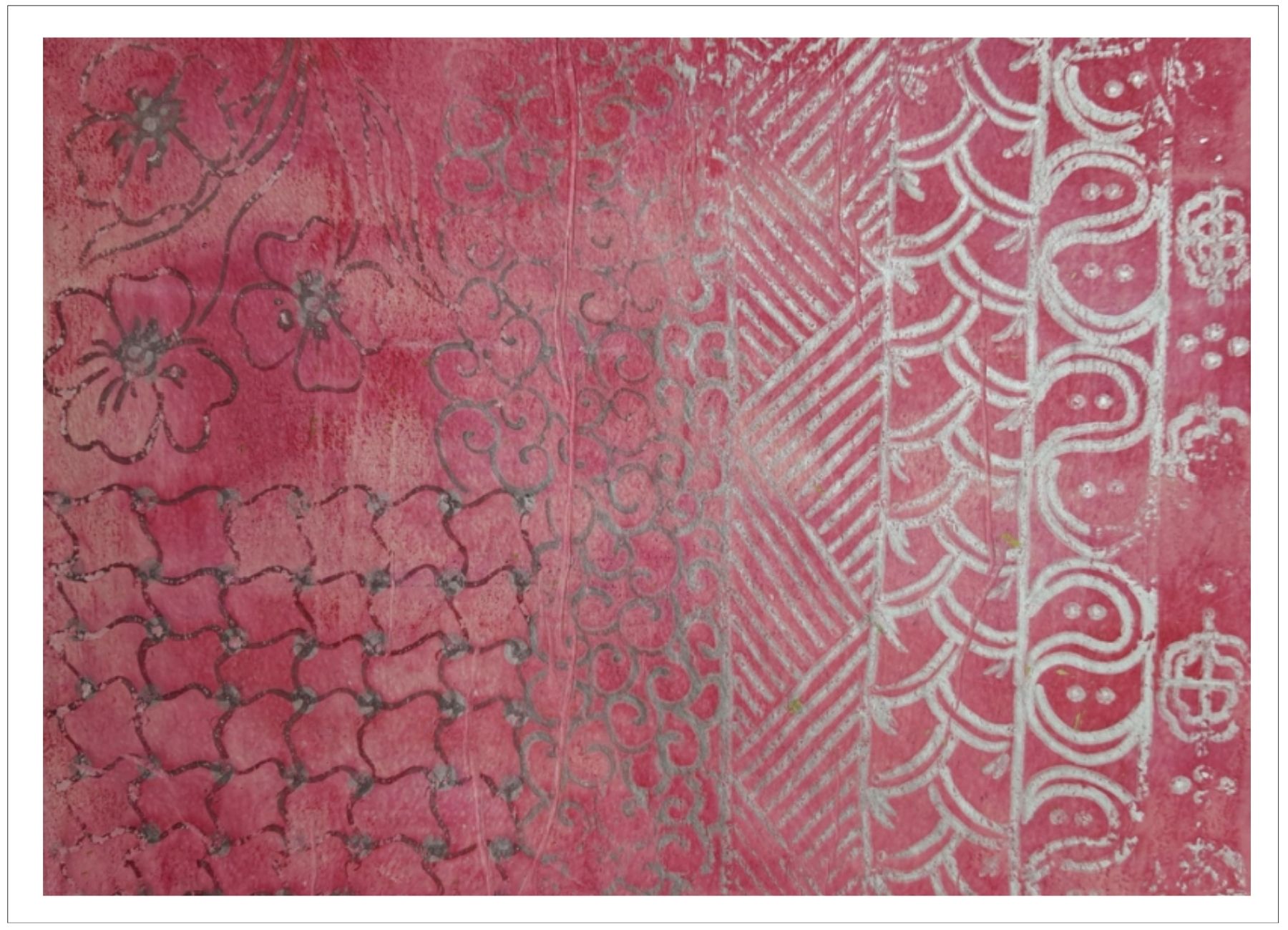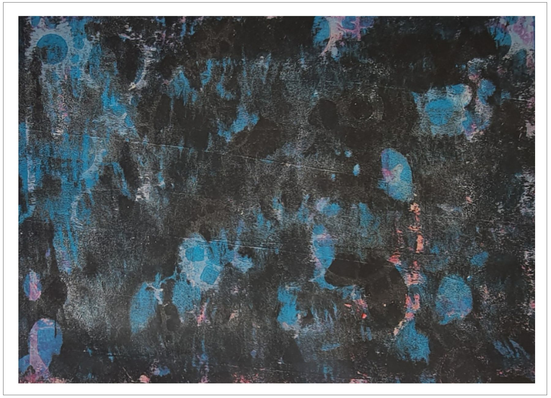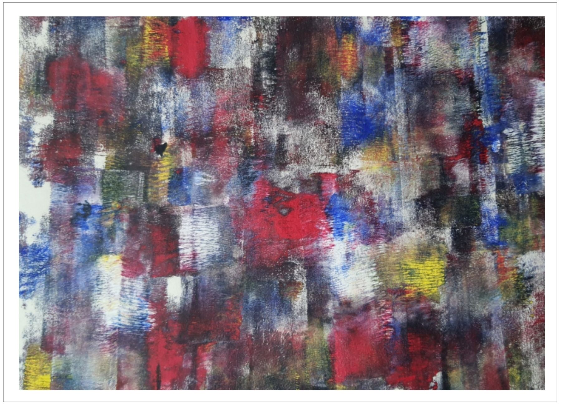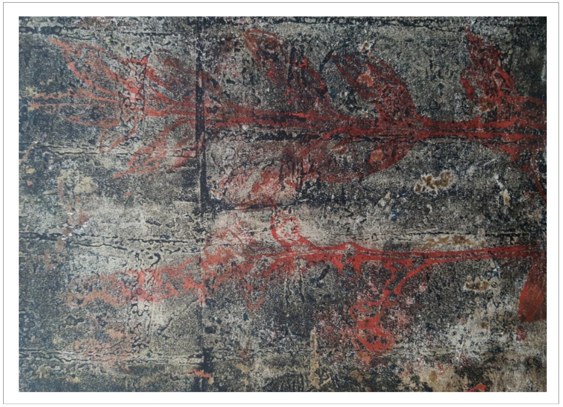Každý otisk vzniká postupným přidáváním vrstev, tvarů a textur. Proces je hravý a otevřený – nikdy není úplně jasné, jak bude výsledný obraz vypadat.