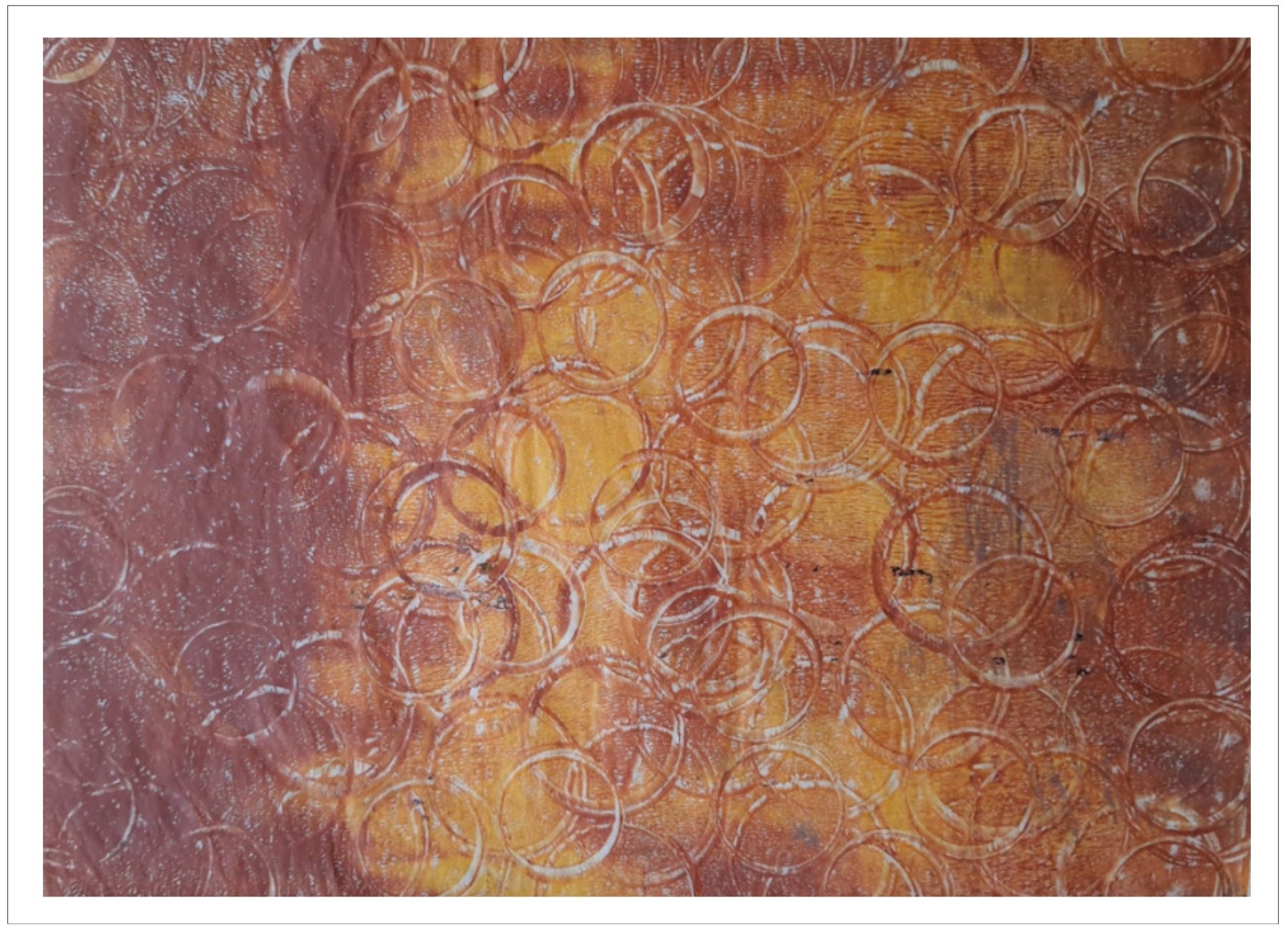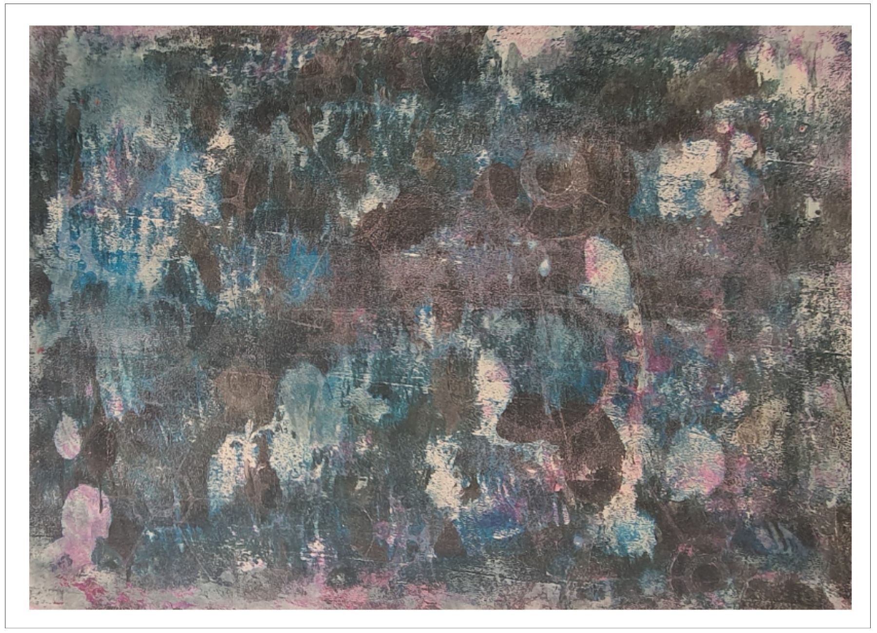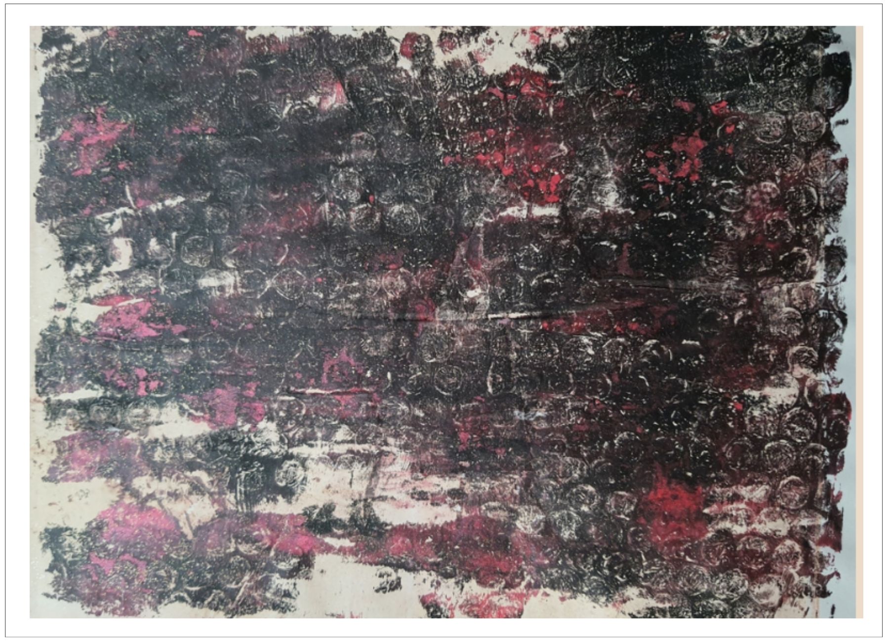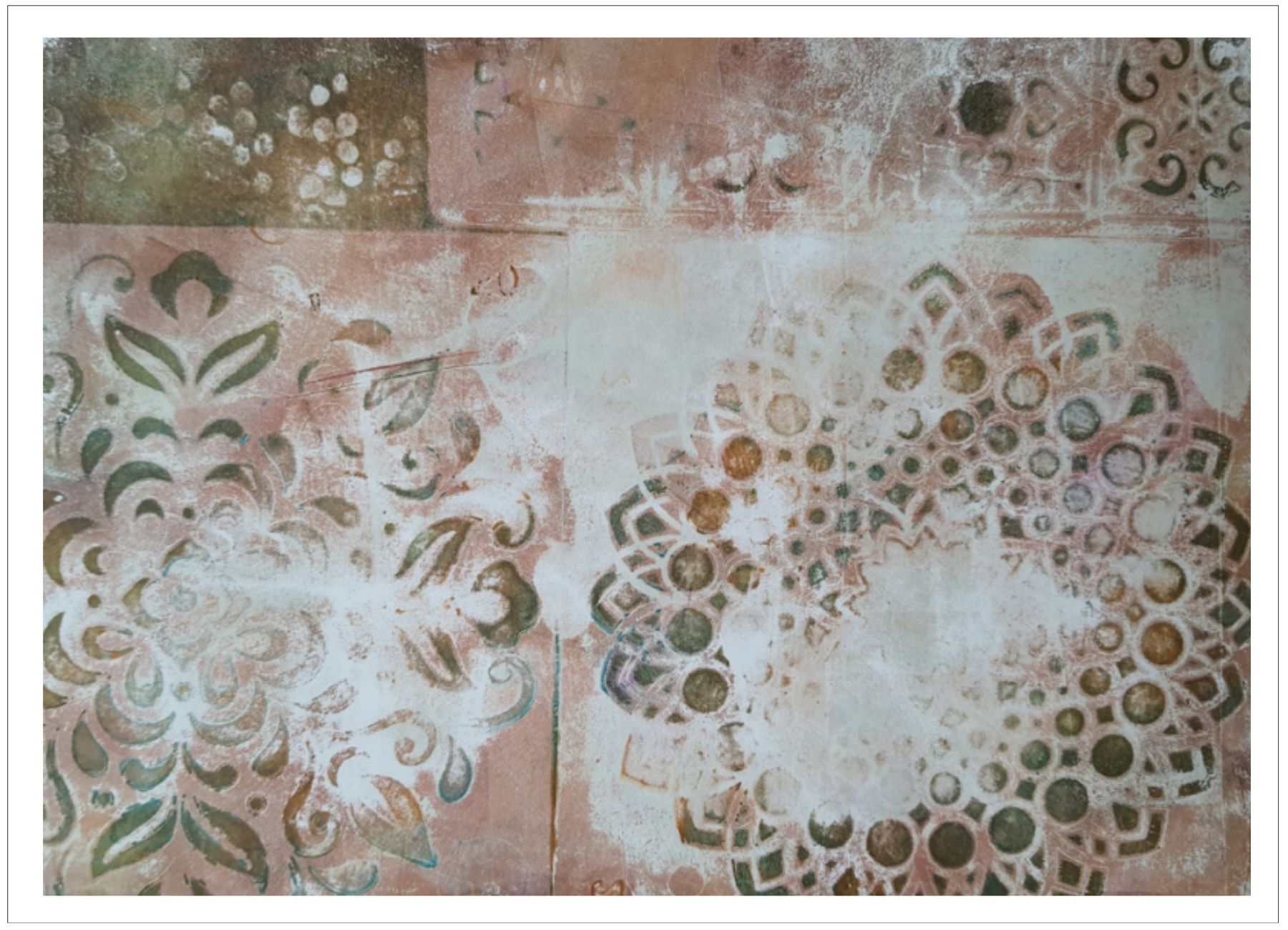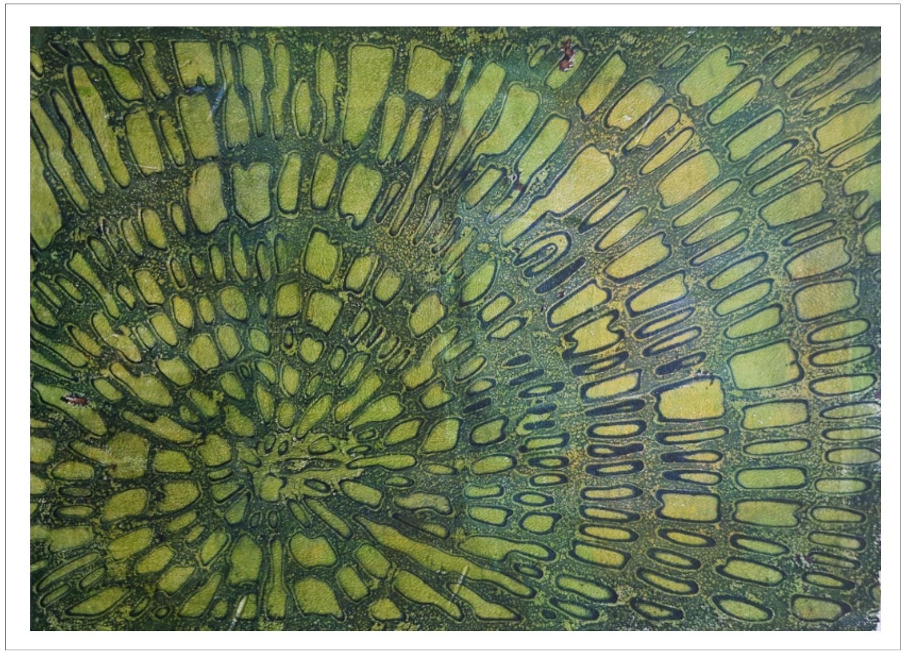 Každý otisk vzniká postupným přidáváním vrstev, tvarů a textur. Proces je hravý a otevřený – nikdy není úplně jasné, jak bude výsledný obraz vypadat.