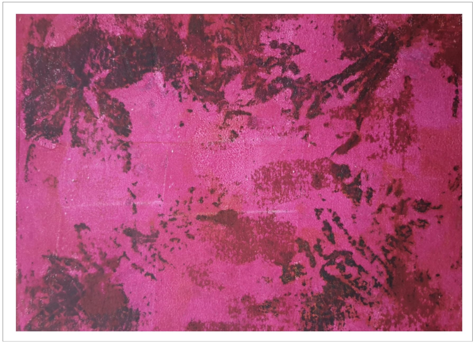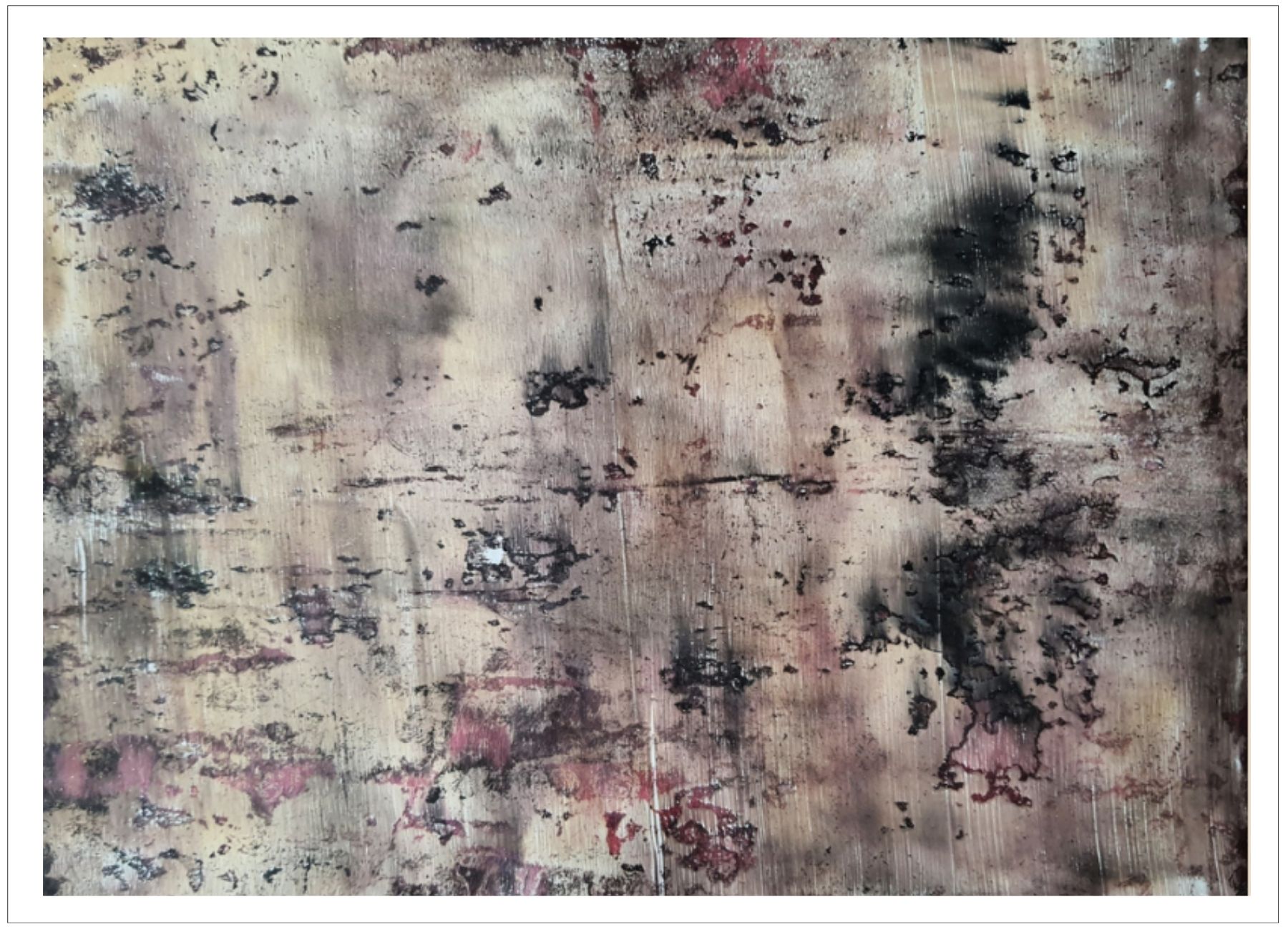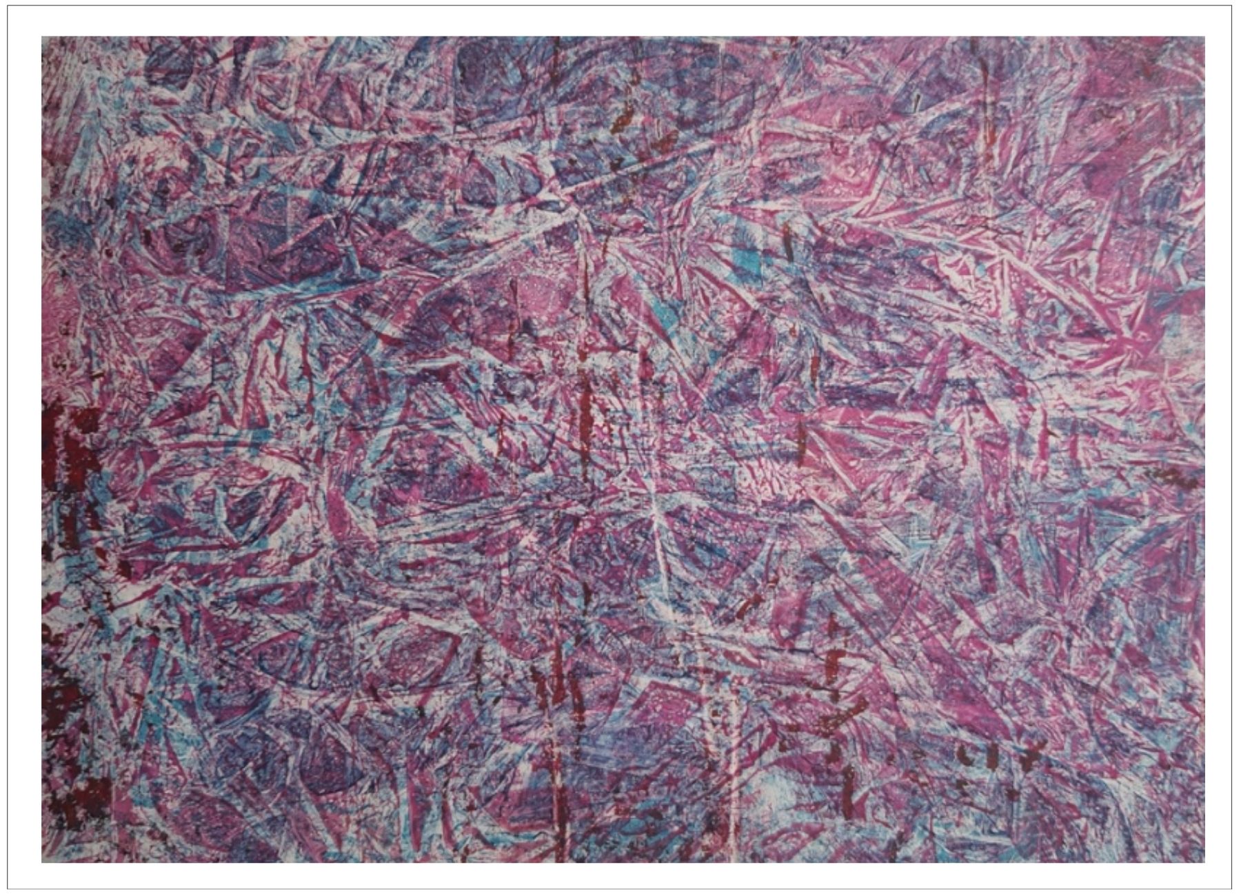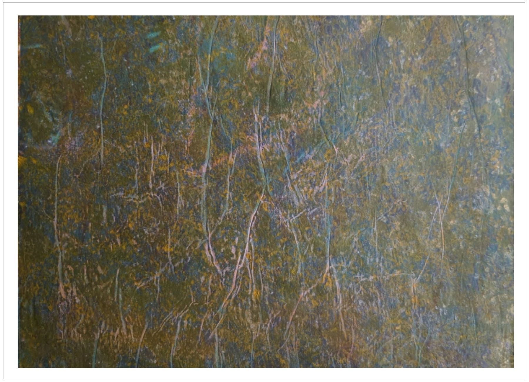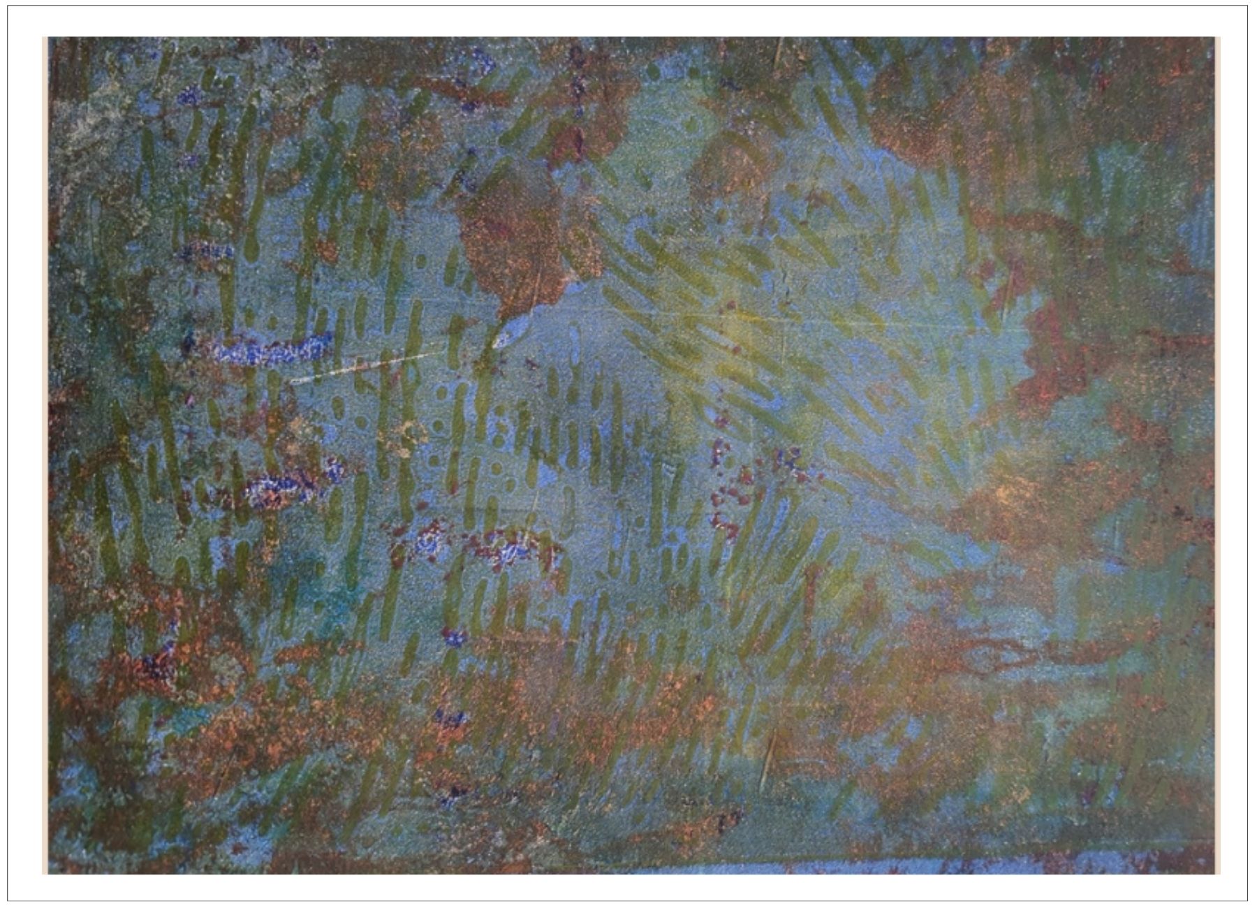 Každý otisk vzniká postupným přidáváním vrstev, tvarů a textur. Proces je hravý a otevřený – nikdy není úplně jasné, jak bude výsledný obraz vypadat.