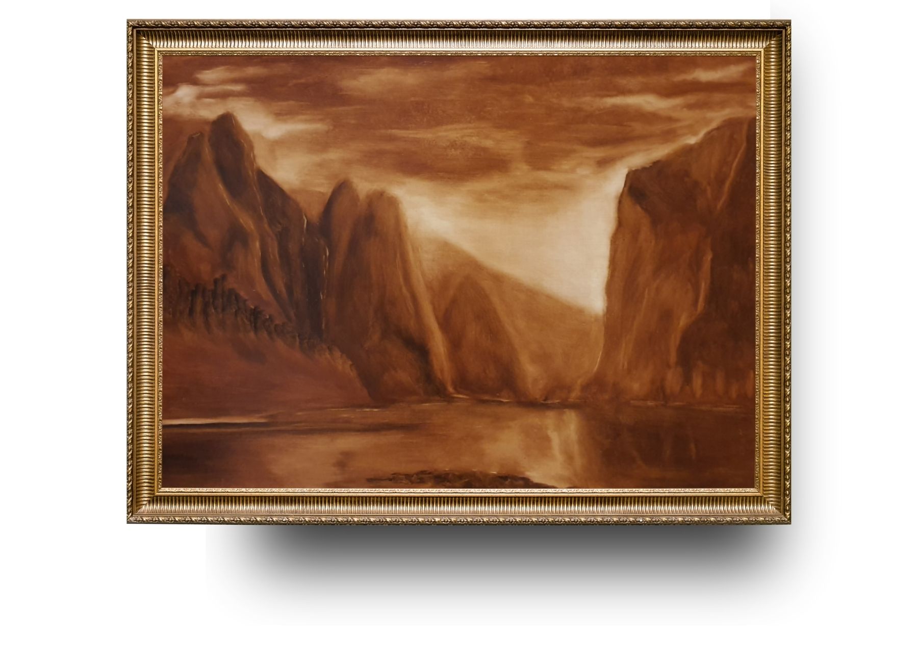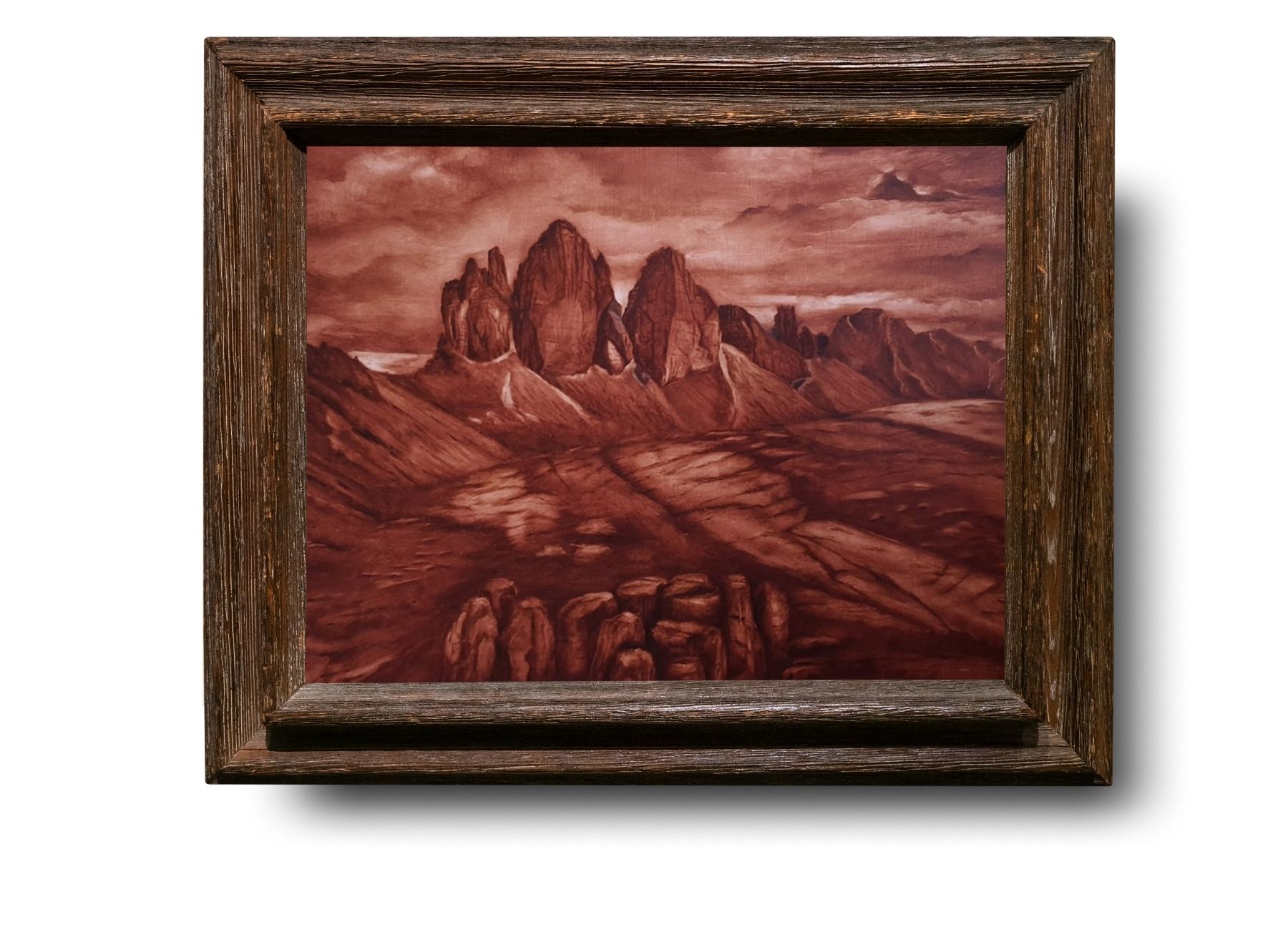 Dolomity. Rozměr 45x50 cm. Monochromatická malba na desce.