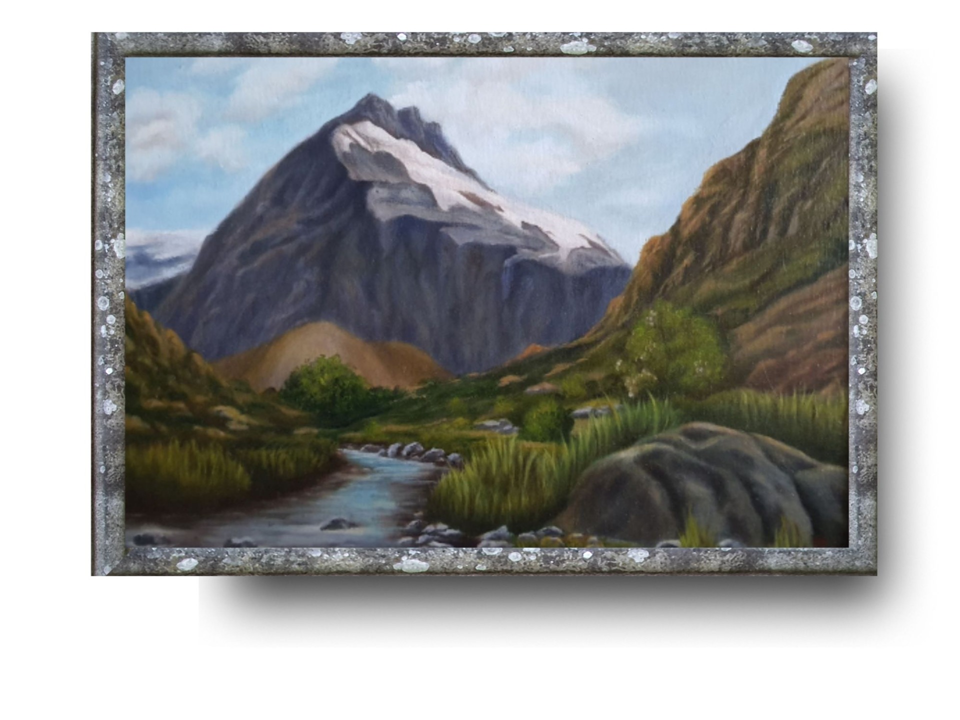Horská krajina s řekou. Rozměr 45x50 cm. Malováno na desce.