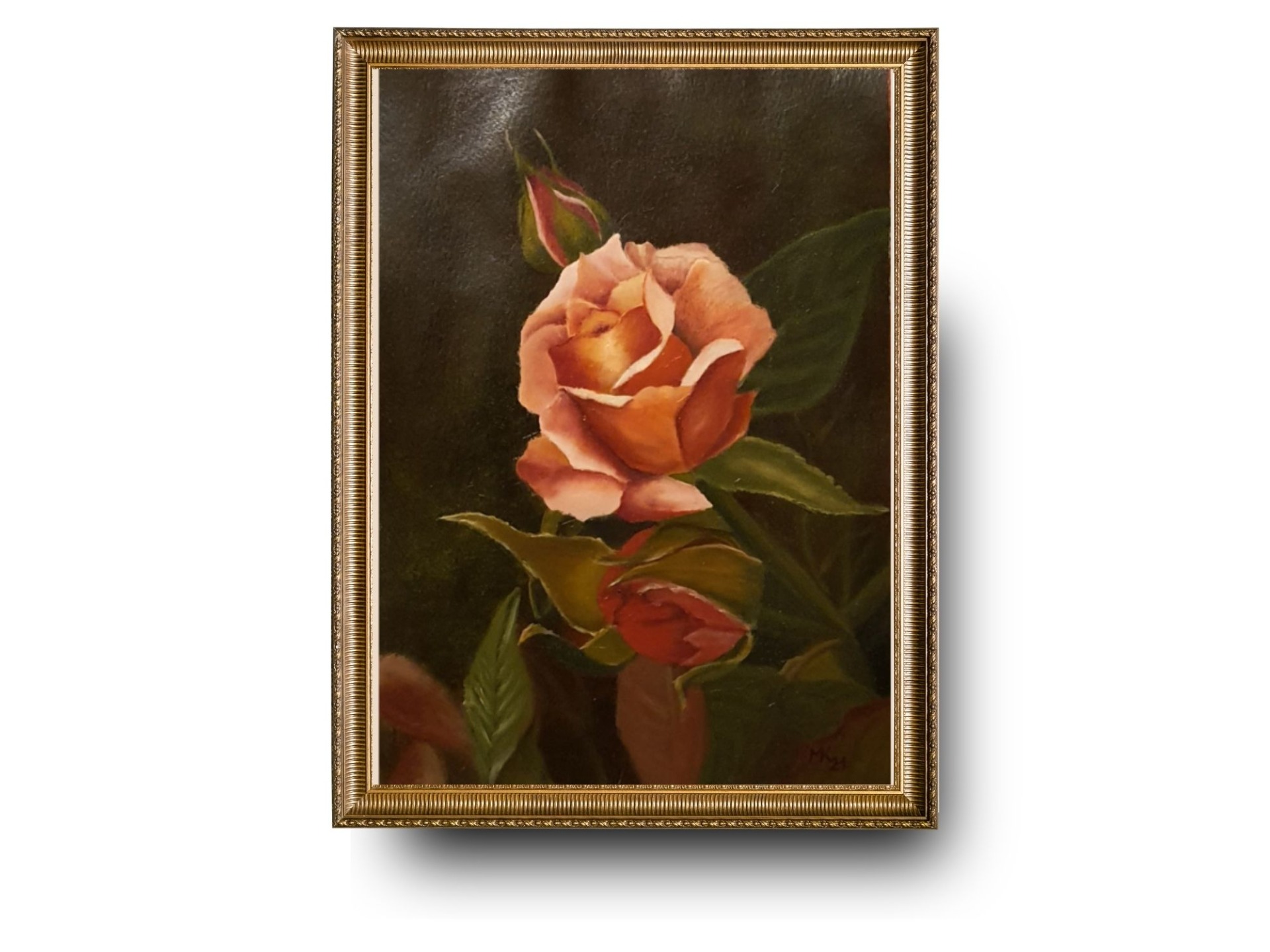 Růžička s poupětem. Rozměr 32x23 cm. Malováno na desce.